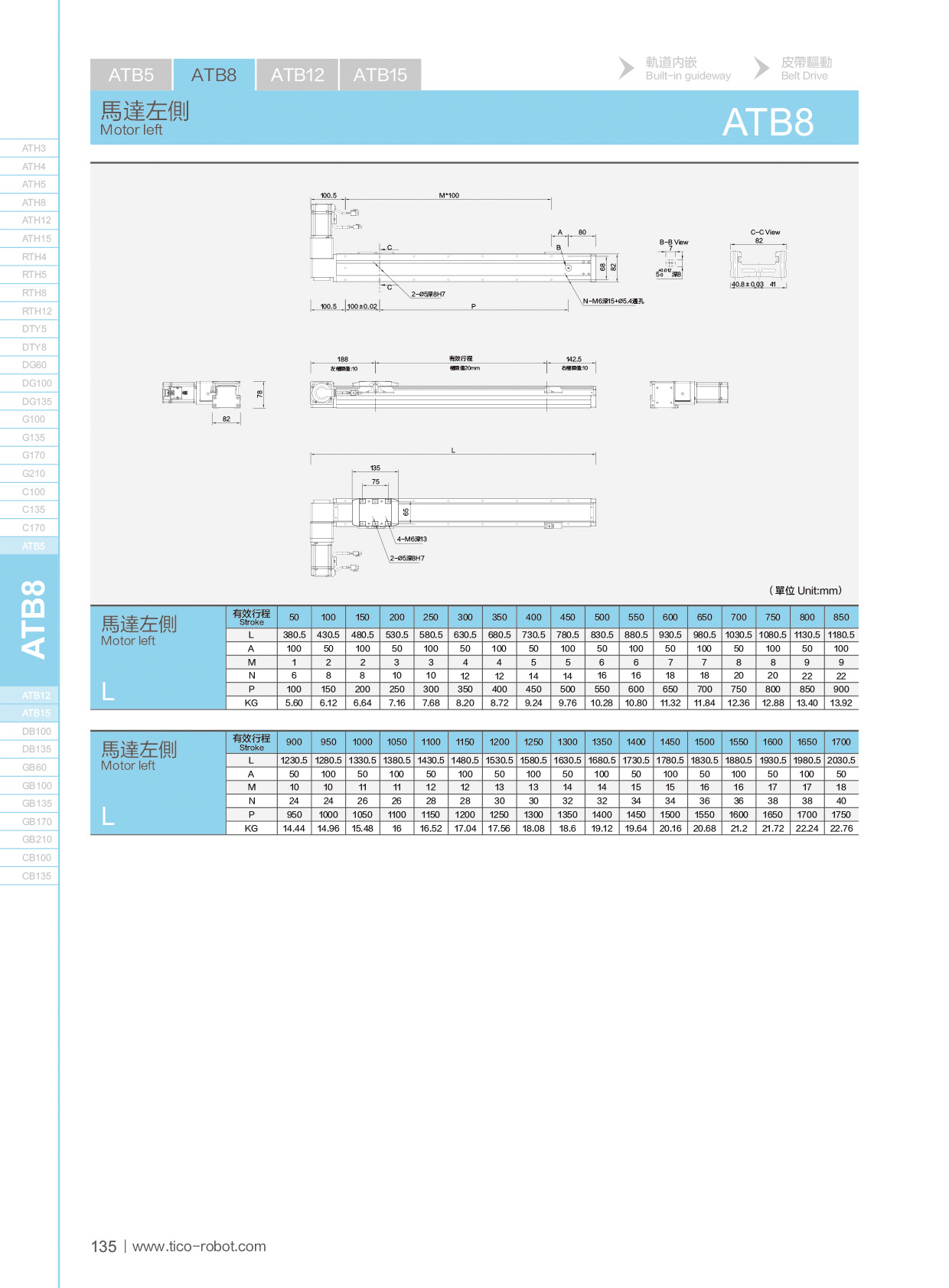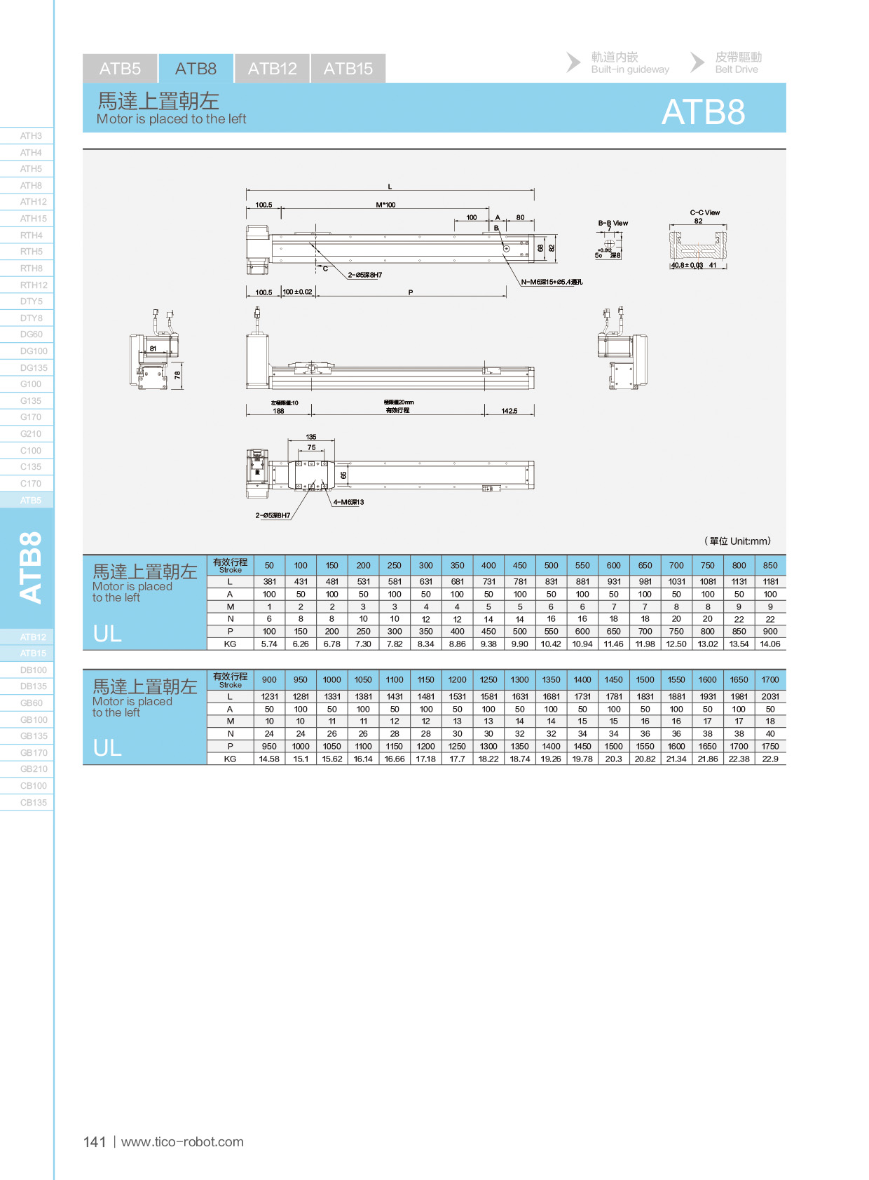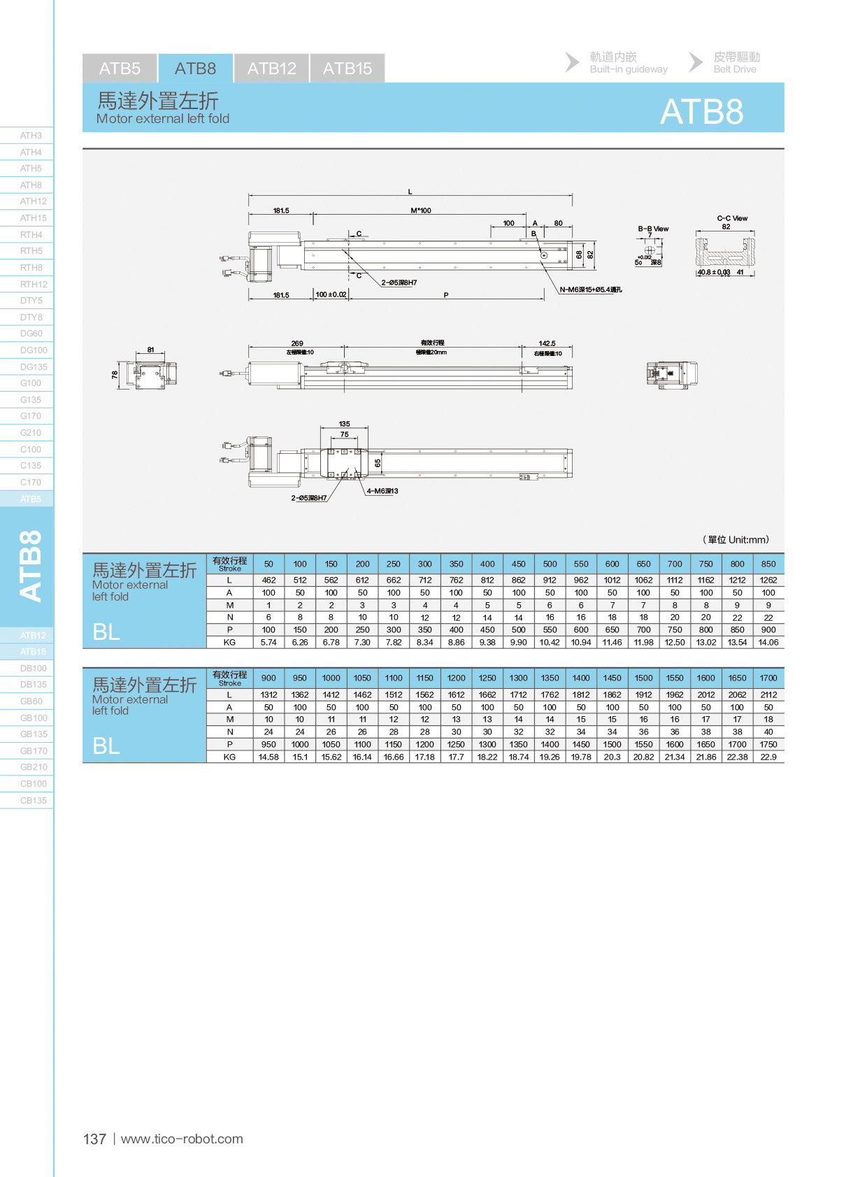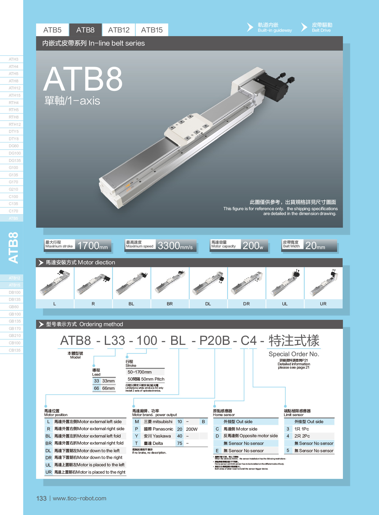 ATB系列采用同步带传动,速度快,配置伺服电机可达4200mm/s,重复精度:±0.04,同步带滑台模组-特别适用于高速运动需求。