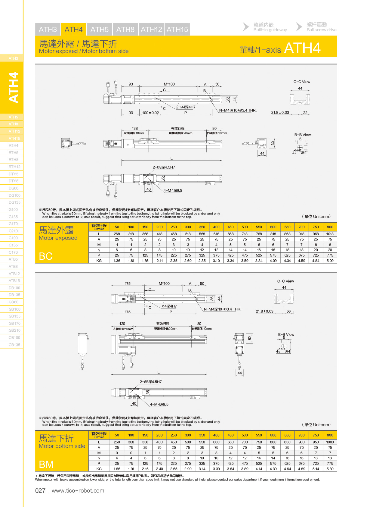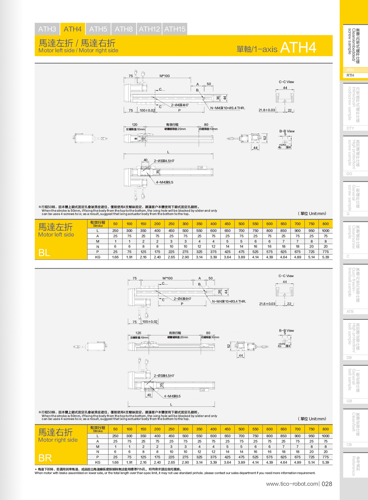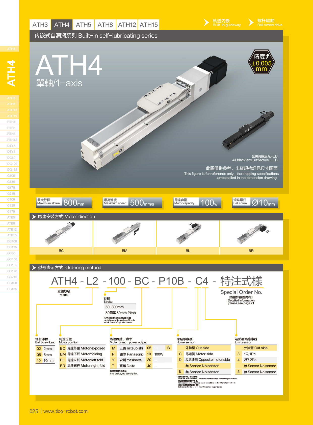 ATH系列采用丝杆,传动重复精度高,配置轧制丝杆重复精度:±0.01,配置研磨丝杆重复精度:±0.005。